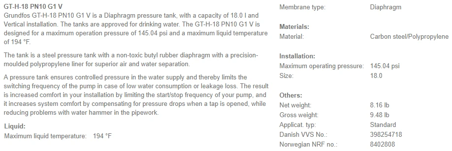 The Grundfos GT pressure tanks are long-life tanks ideally suited for controlling the pressure in domestic as well as industrial applications in cold-water (drinking-water) systems.