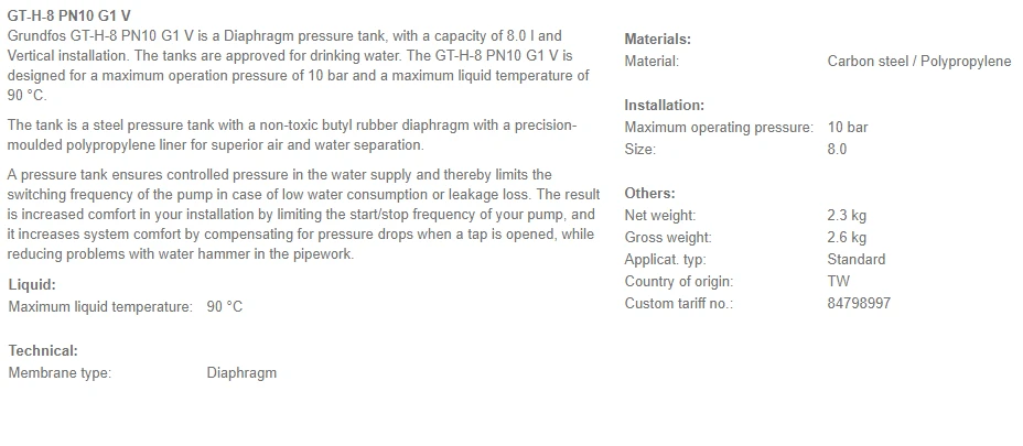 The Grundfos GT pressure tanks are long-life tanks ideally suited for controlling the pressure in domestic as well as industrial applications in cold-water (drinking-water) systems.
