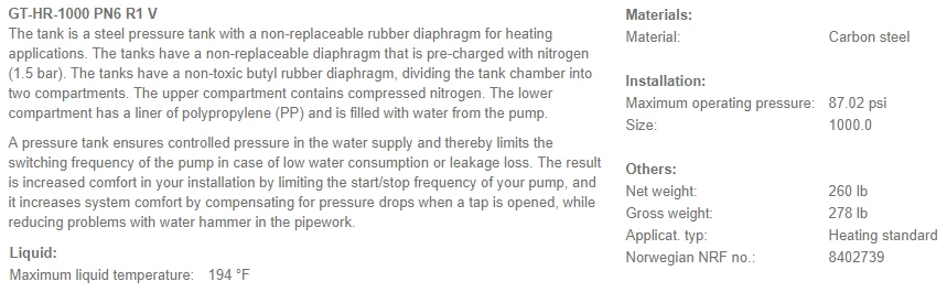 Grundfos GT-HR-1000-V (1000L) 6 Bar Rated Hot Water Diaphragm Tank