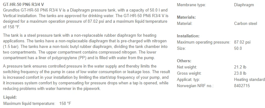 Grundfos GT-HR-50-V (50L) 6 Bar Rated Hot Water Diaphragm Tank