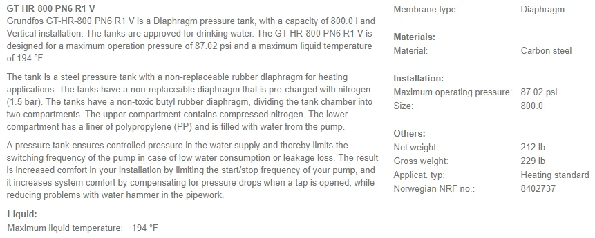 Grundfos GT-HR-800-V (800L) 6 Bar Rated Hot Water Diaphragm Tank