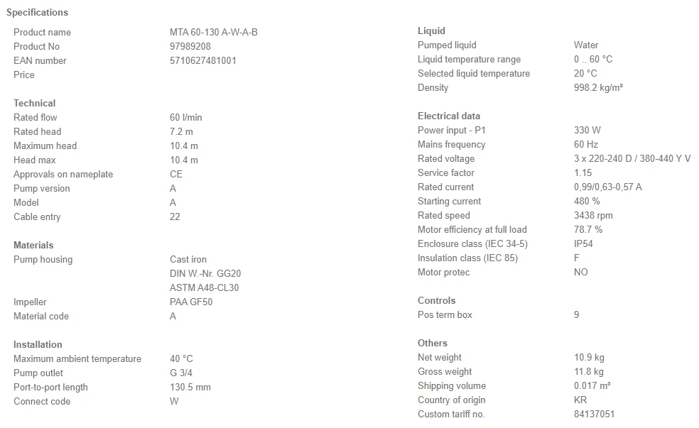 - Phase: – The pump is fitted with a 3-phase integrated motor.