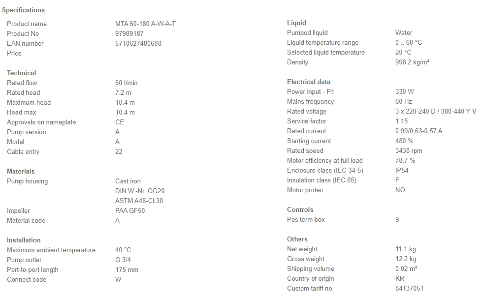- Phase: – The pump is fitted with a 3-phase integrated motor.