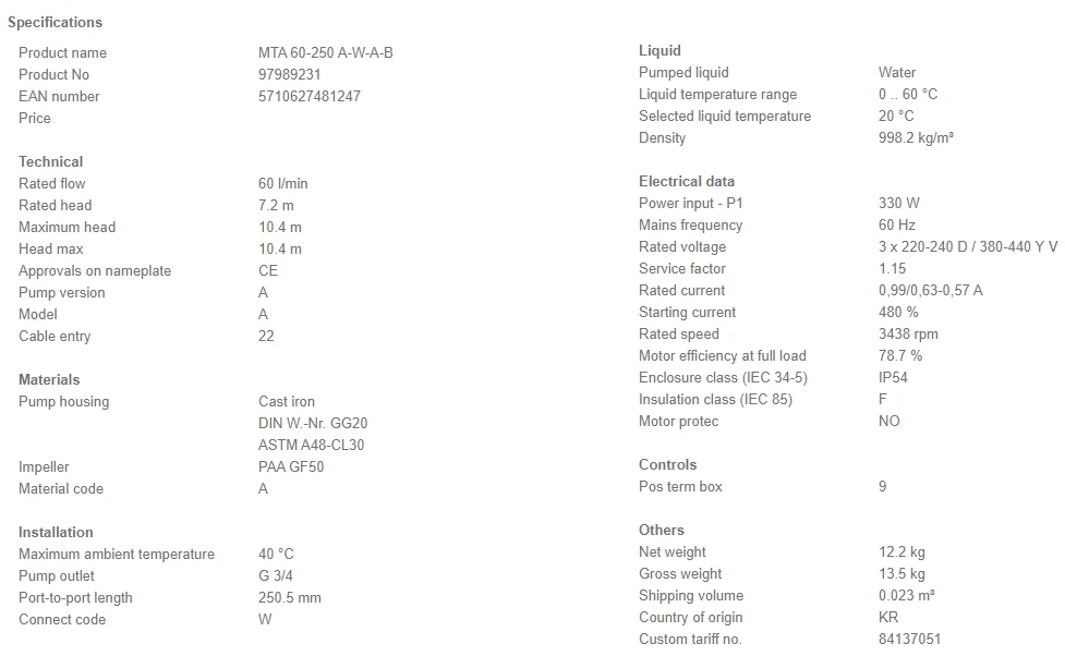 - Phase: – The pump is fitted with a 3-phase integrated motor.