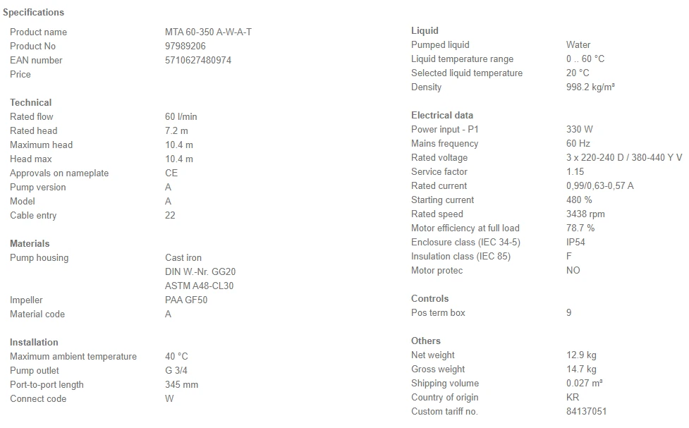 - Phase: – The pump is fitted with a 3-phase integrated motor.