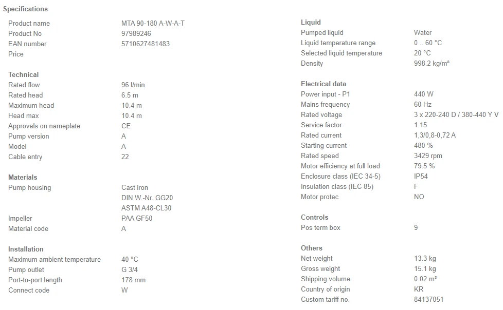 - Phase: – The pump is fitted with a 3-phase integrated motor.