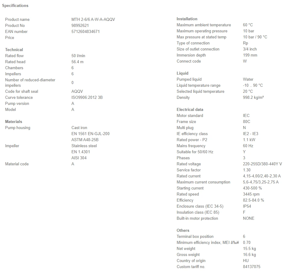 Grundfos MTH 2 6/6 A W A AQQV 1.1kW Stainless Steel Immersible Pump 415v