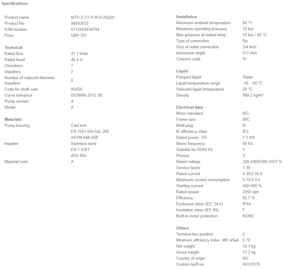 Grundfos MTH 2 7/7 A W A AQQV 1.1kW Stainless Steel Immersible Pump 415v