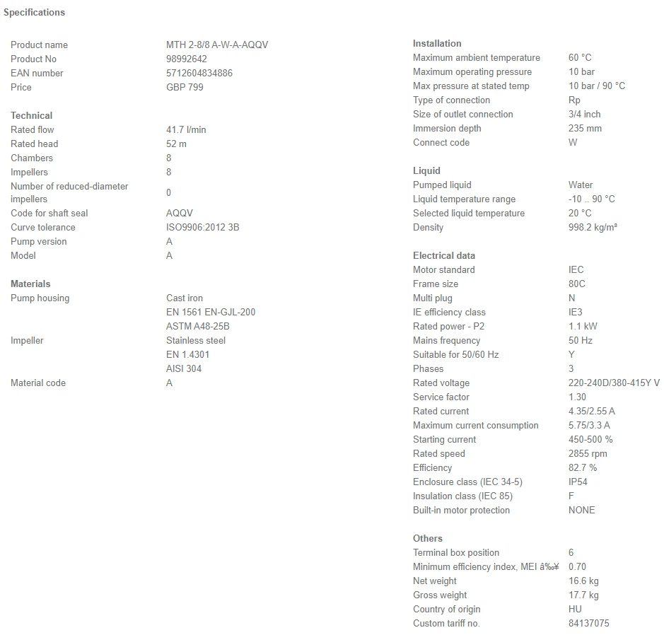 Grundfos MTH 2 8/8 A W A AQQV 1.1kW Stainless Steel Immersible Pump 415v