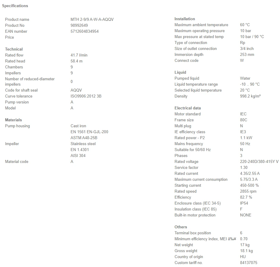 Grundfos MTH 2 9/9 A W A AQQV 1.1kW Stainless Steel Immersible Pump 415v