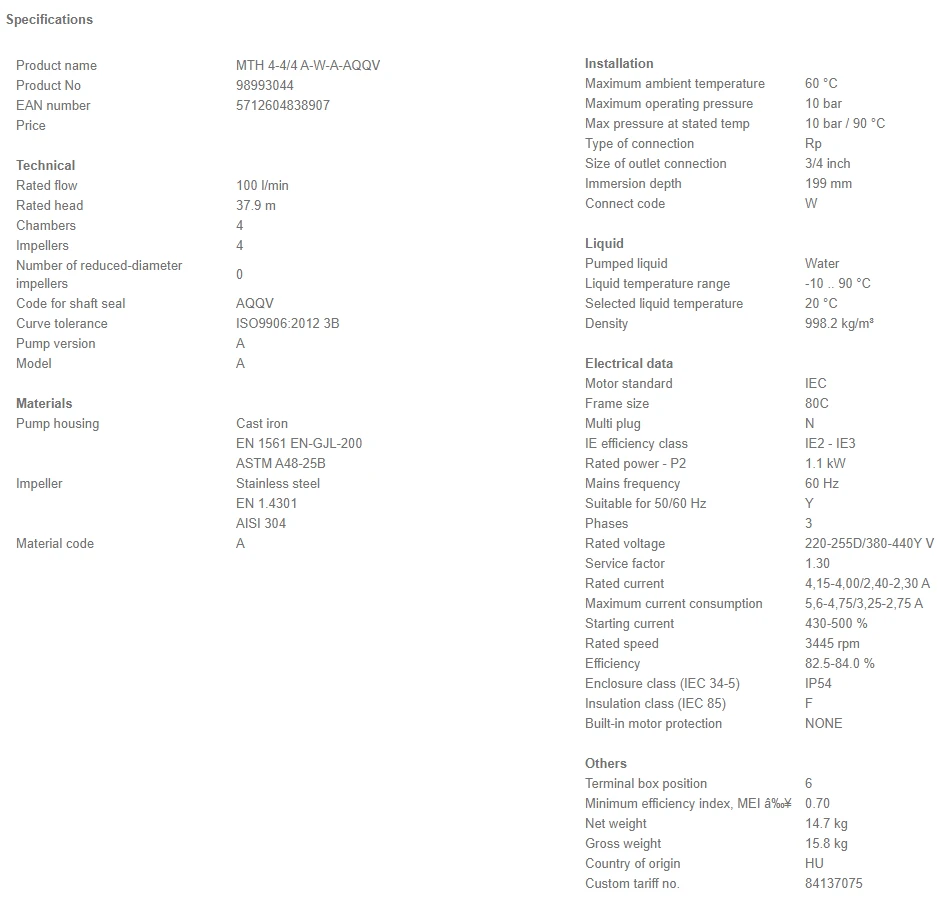 Grundfos MTH 4 4/4 A W A AQQV 1.1kW Stainless Steel Immersible Pump 415v