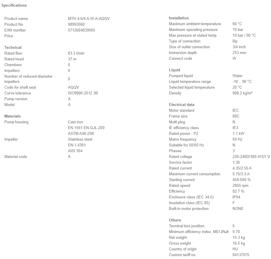 Grundfos MTH 4 6/6 A W A AQQV 1.1kW Stainless Steel Immersible Pump 415v