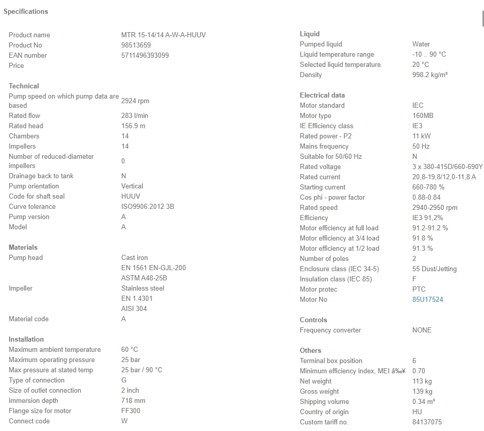 Grundfos MTR 15 14/14 A W A HUUV 11kW Stainless Steel Vertical Immersible Pump 415v