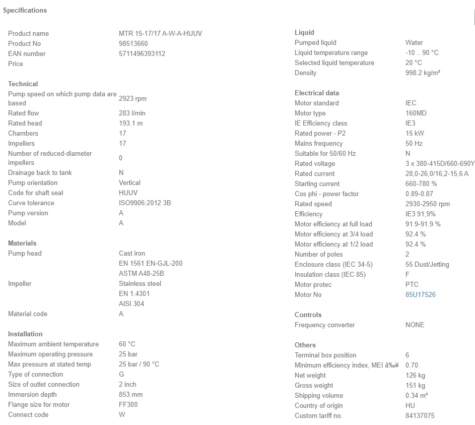 Grundfos MTR 15 17/17 A W A HUUV 15kW Stainless Steel Vertical Immersible Pump 415v
