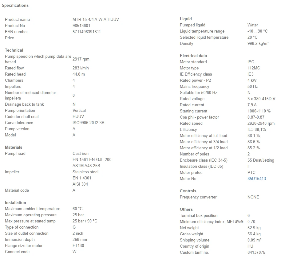 Grundfos MTR 15 4/4 A W A HUUV 4kW Stainless Steel Vertical Immersible Pump 415v