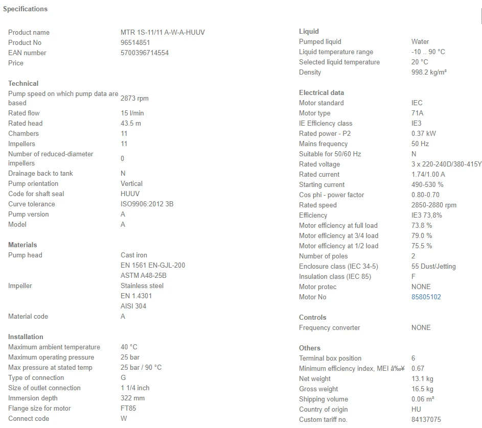 Grundfos MTR 1S 11/11 A W A HUUV 0.37kW Stainless Steel Vertical Immersible Pump 415v