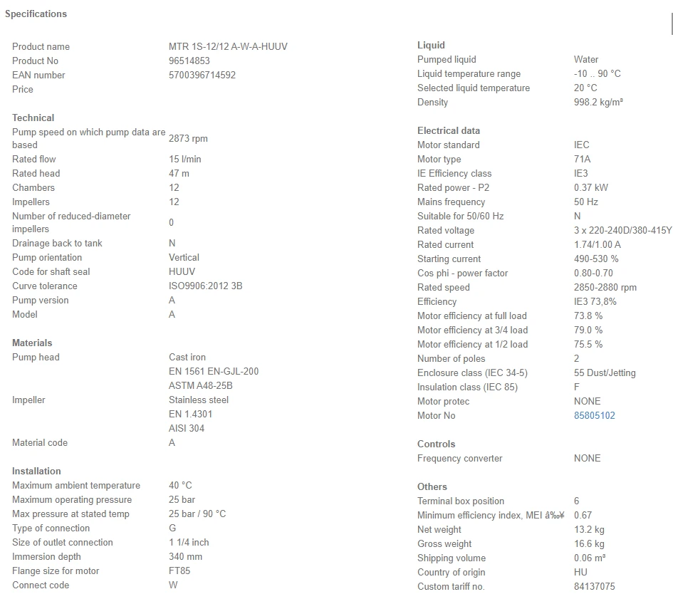 Grundfos MTR 1S 12/12 A W A HUUV 0.37kW Stainless Steel Vertical Immersible Pump 415v