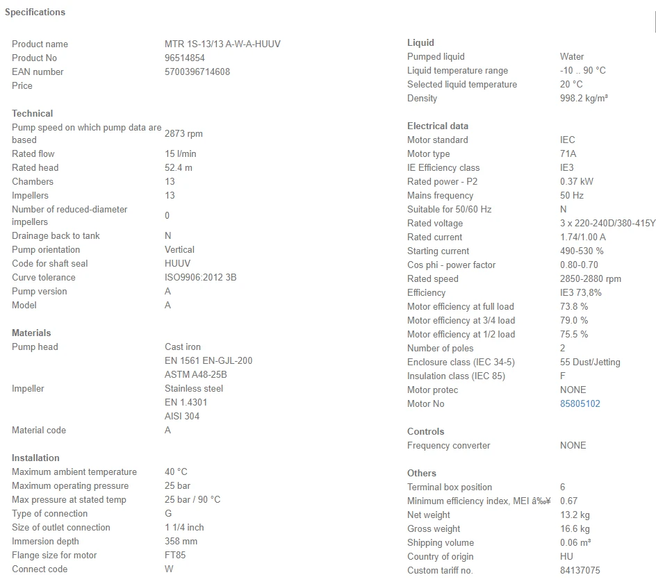 Grundfos MTR 1S 13/13 A W A HUUV 0.55kW Stainless Steel Vertical Immersible Pump 415v