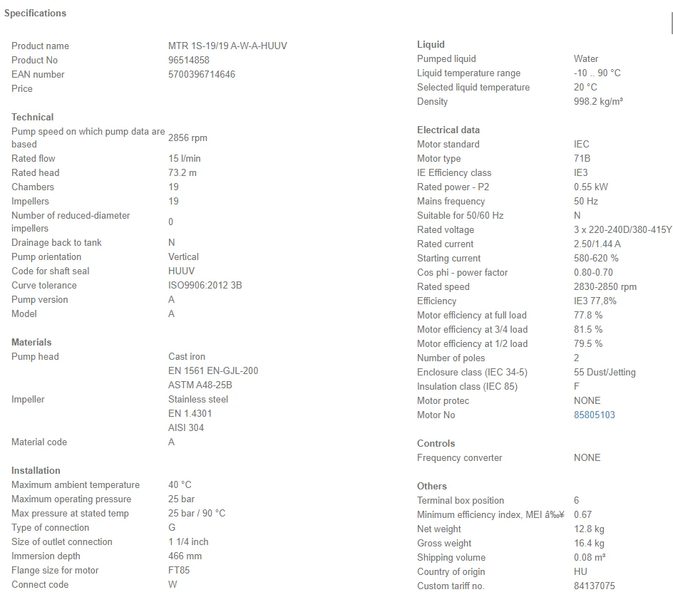 Grundfos MTR 1S 19/19 A W A HUUV 0.55kW Stainless Steel Vertical Immersible Pump 415v