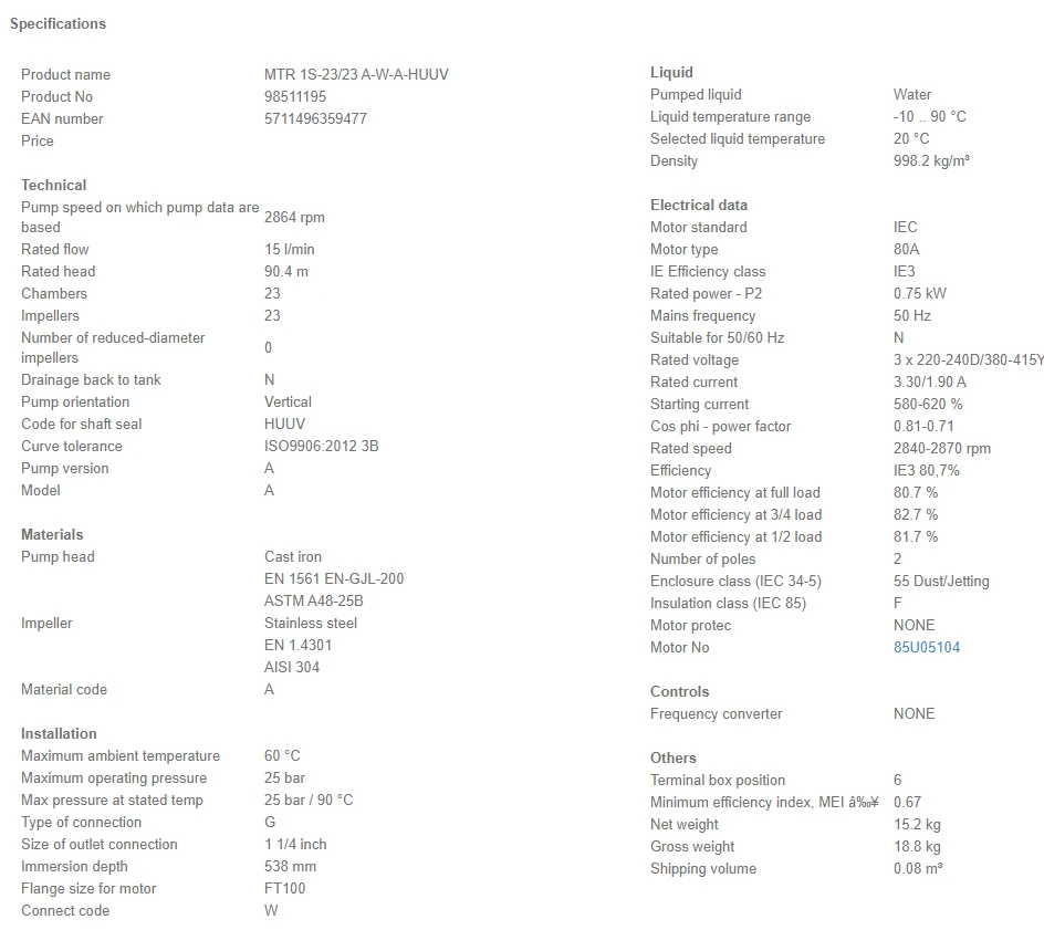 Grundfos MTR 1S 23/23 A W A HUUV 0.75kW Stainless Steel Vertical Immersible Pump 415v