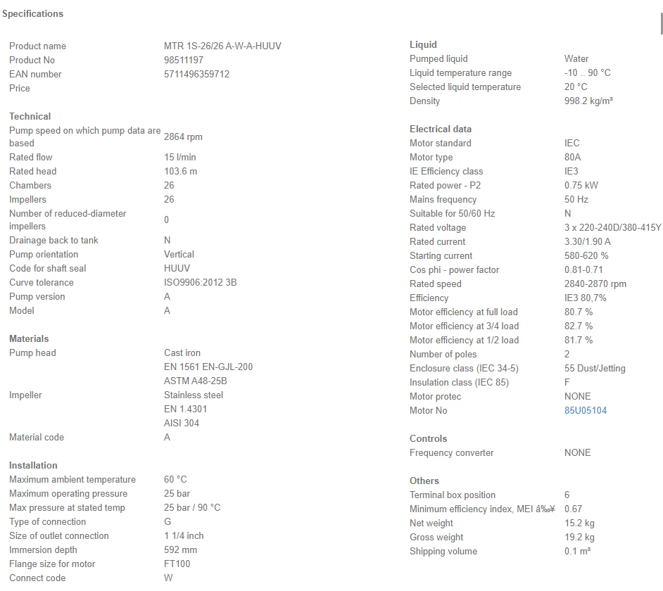 Grundfos MTR 1S 26/26 A W A HUUV 1.1kW Stainless Steel Vertical Immersible Pump 415v