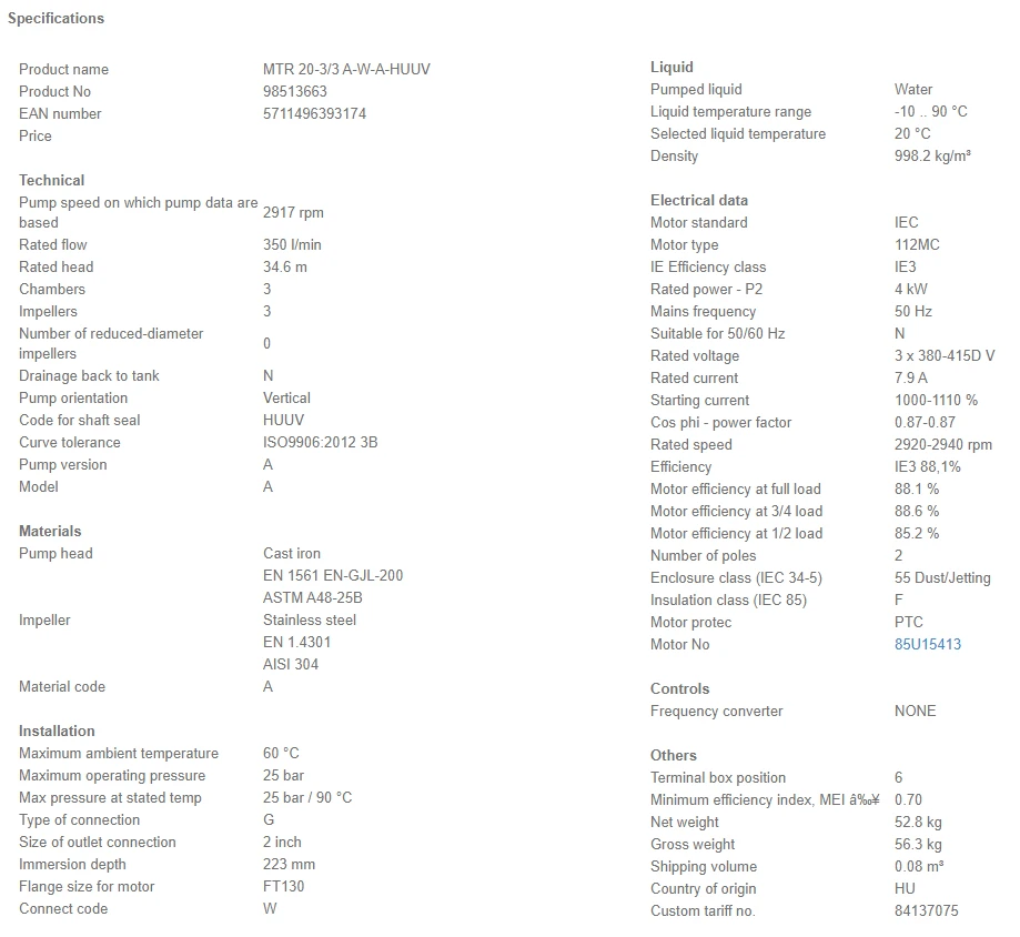 Grundfos MTR 20 3/3 A W A HUUV 4kW Stainless Steel Vertical Immersible Pump 415v