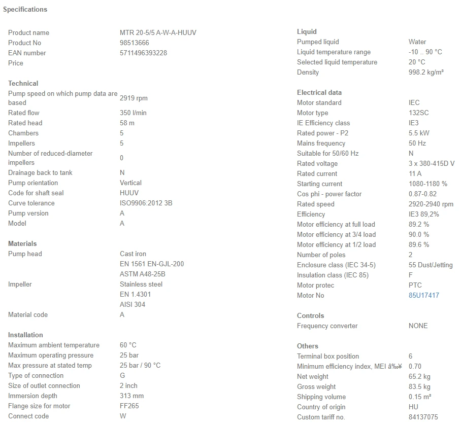 Grundfos MTR 20 5/5 A W A HUUV 5.5kW Stainless Steel Vertical Immersible Pump 415v