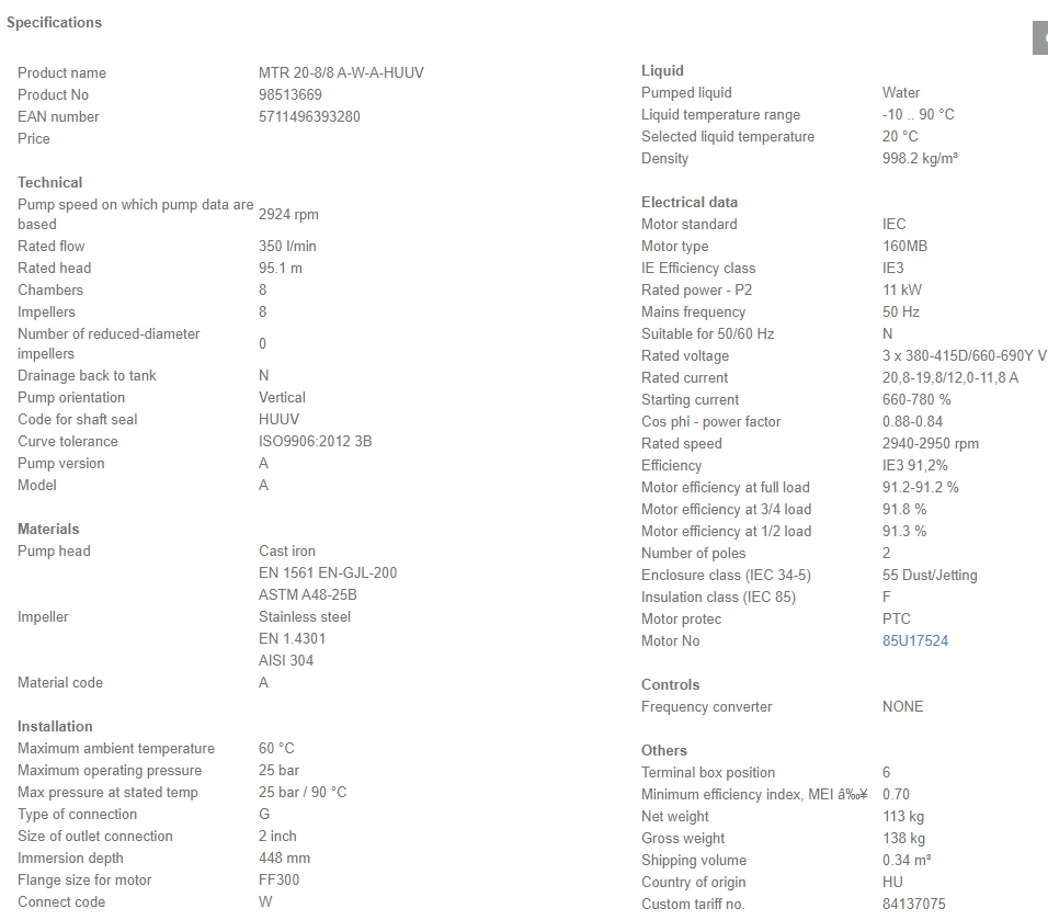 Grundfos MTR 20 8/8 A W A HUUV 11kW Stainless Steel Vertical Immersible Pump 415v