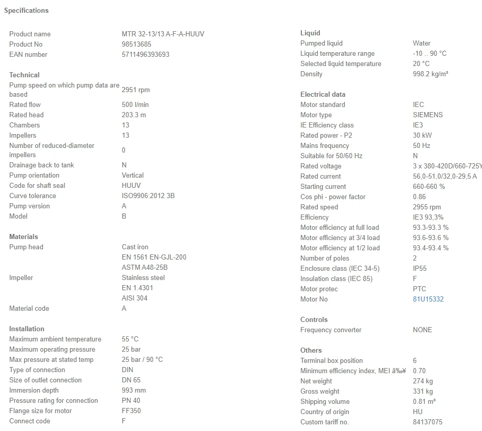 Grundfos MTR 32 13/13 A W A HUUV 30kW Stainless Steel Vertical Immersible Pump 415v