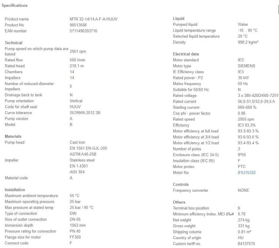 Grundfos MTR 32 14/14 A W A HUUV 30kW Stainless Steel Vertical Immersible Pump 415v
