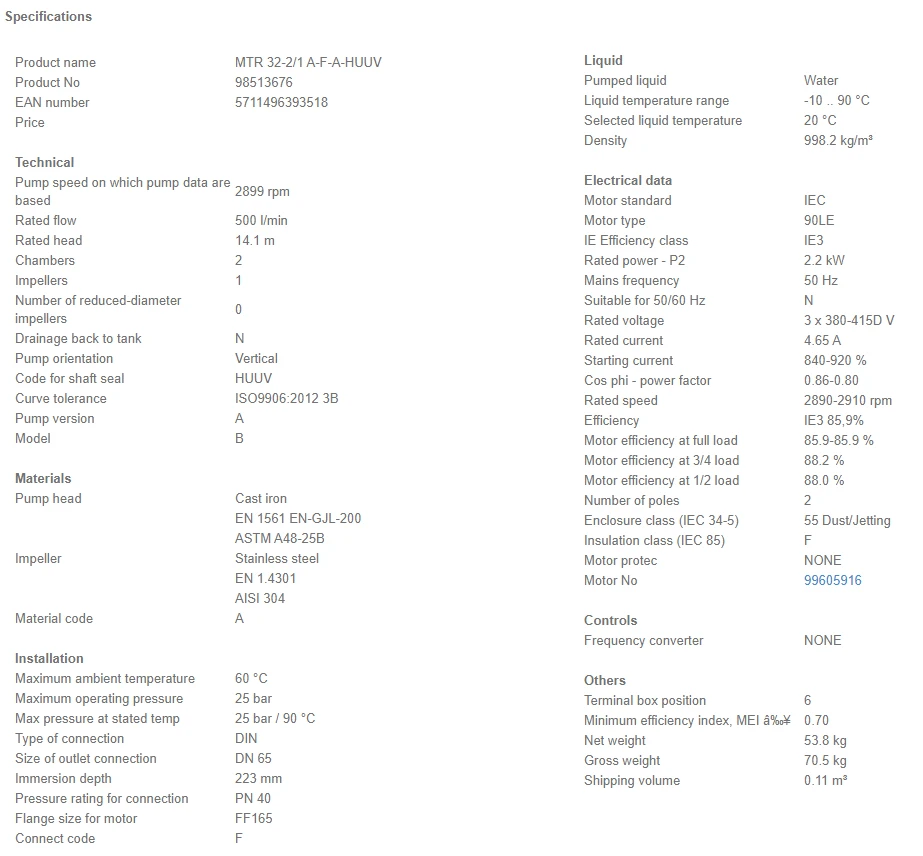 A cartridge shaft seal ensures high reliability, safe handling, and easy access and service. The pump is fitted with a 3-phase, fan-cooled asynchronous motor.