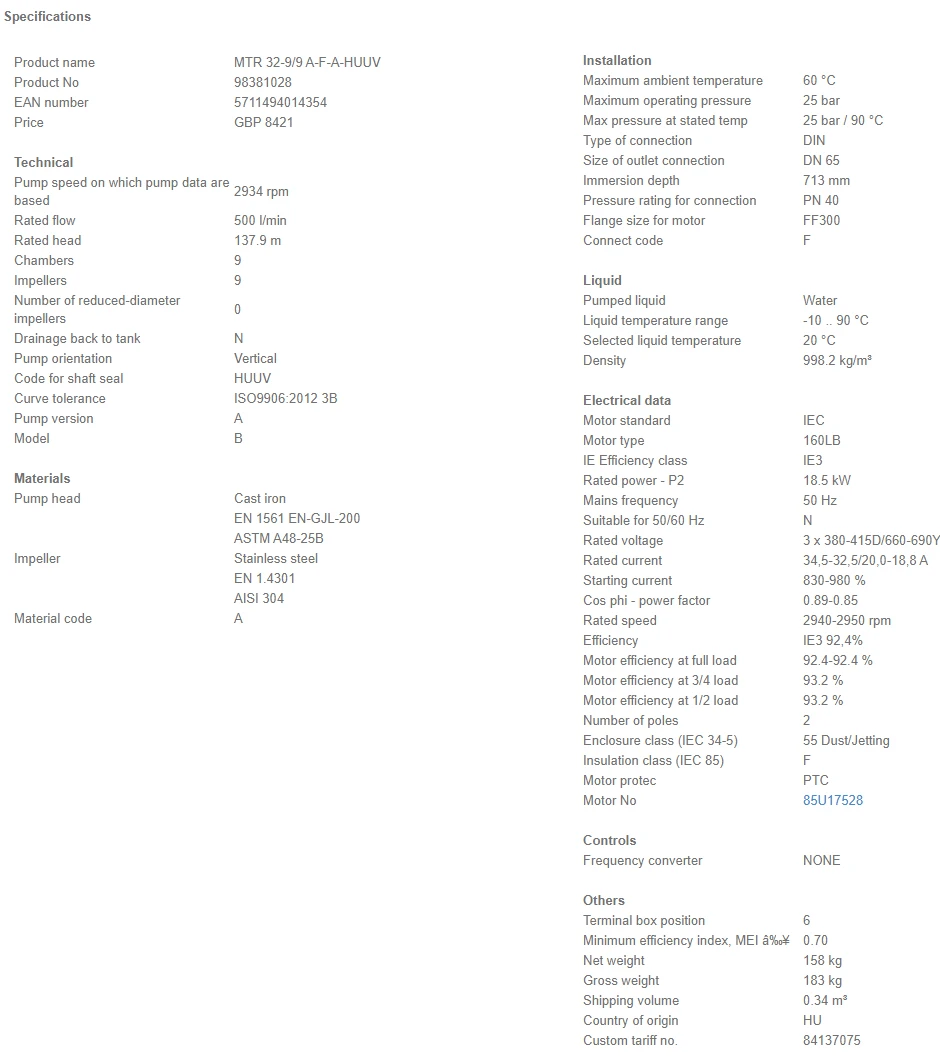Grundfos MTR 32 9/9 A W A HUUV 18.5kW Stainless Steel Vertical Immersible Pump 415v