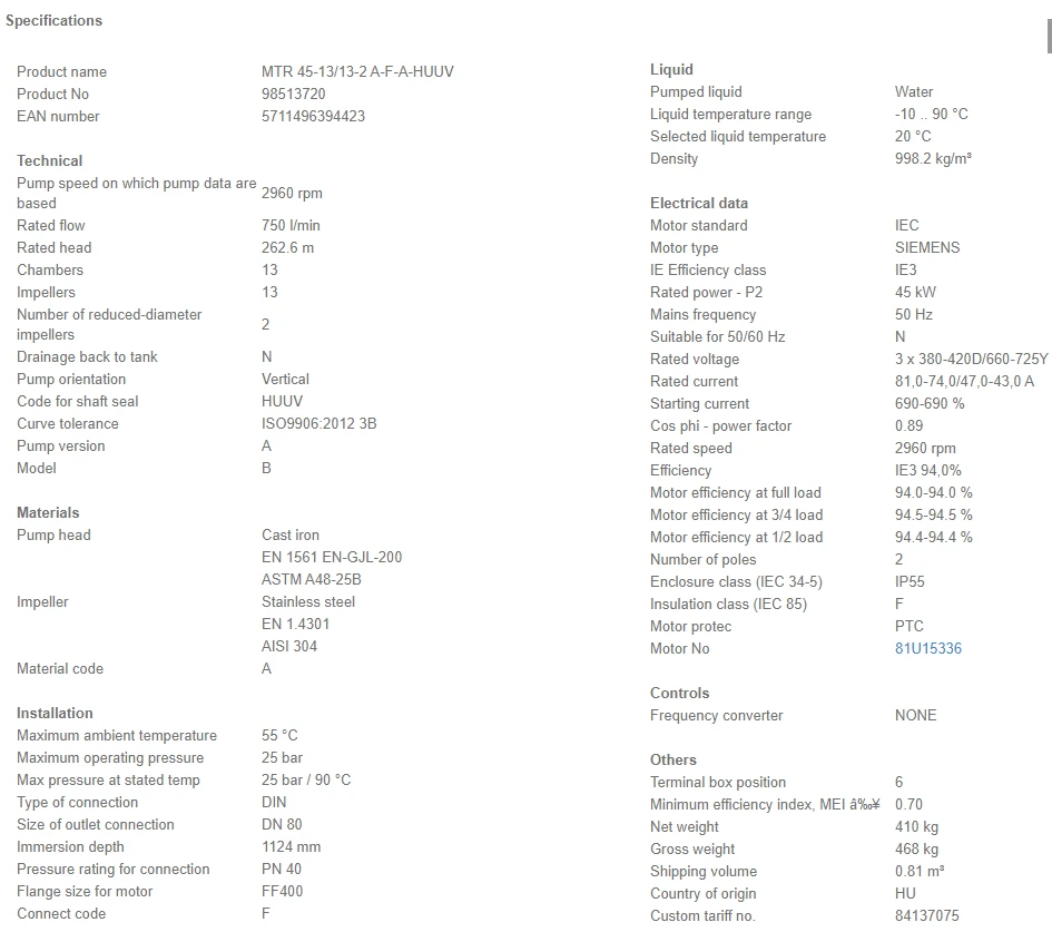 Grundfos MTR 45 13/13-2 A F A HUUV 45kW Stainless Steel Vertical Immersible Pump 415v