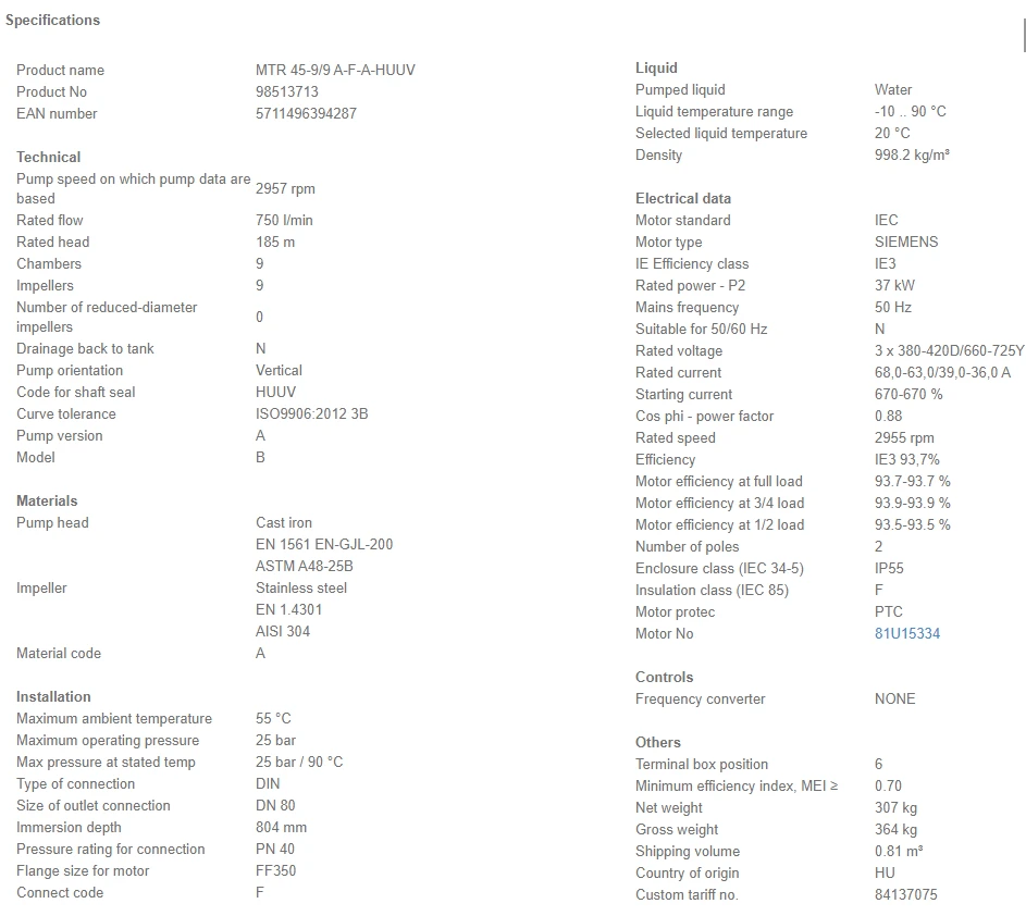 Grundfos MTR 45 9/9 A F A HUUV 37kW Stainless Steel Vertical Immersible Pump 415v