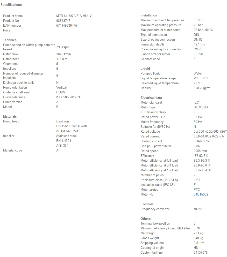 Grundfos MTR 64 5/5 A F A HUUV 30kW Stainless Steel Vertical Immersible Pump 415v