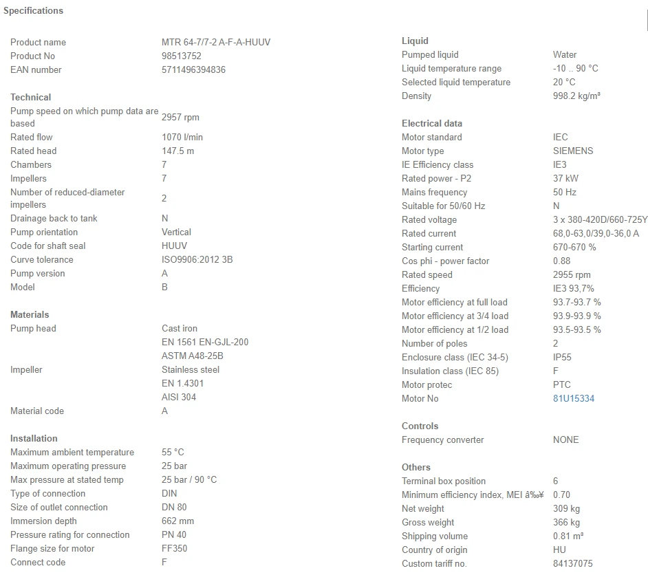 Grundfos MTR 64 7/7-2 A F A HUUV 37kW Stainless Steel Vertical Immersible Pump 415v