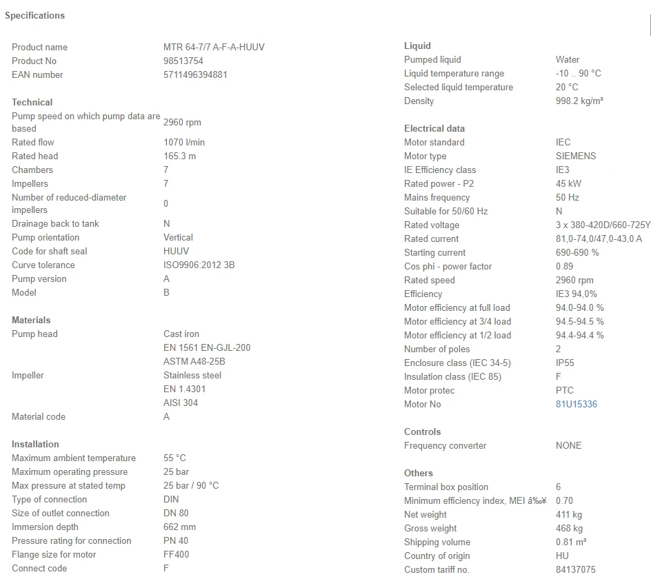Grundfos MTR 64 7/7 A F A HUUV 45kW Stainless Steel Vertical Immersible Pump 415v