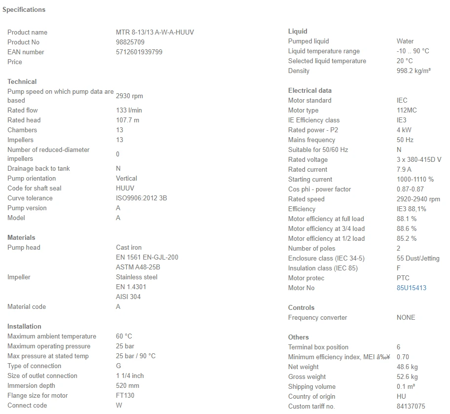Grundfos MTR 8 13/13 A W A HUUV 4kW Stainless Steel Vertical Immersible Pump 415v