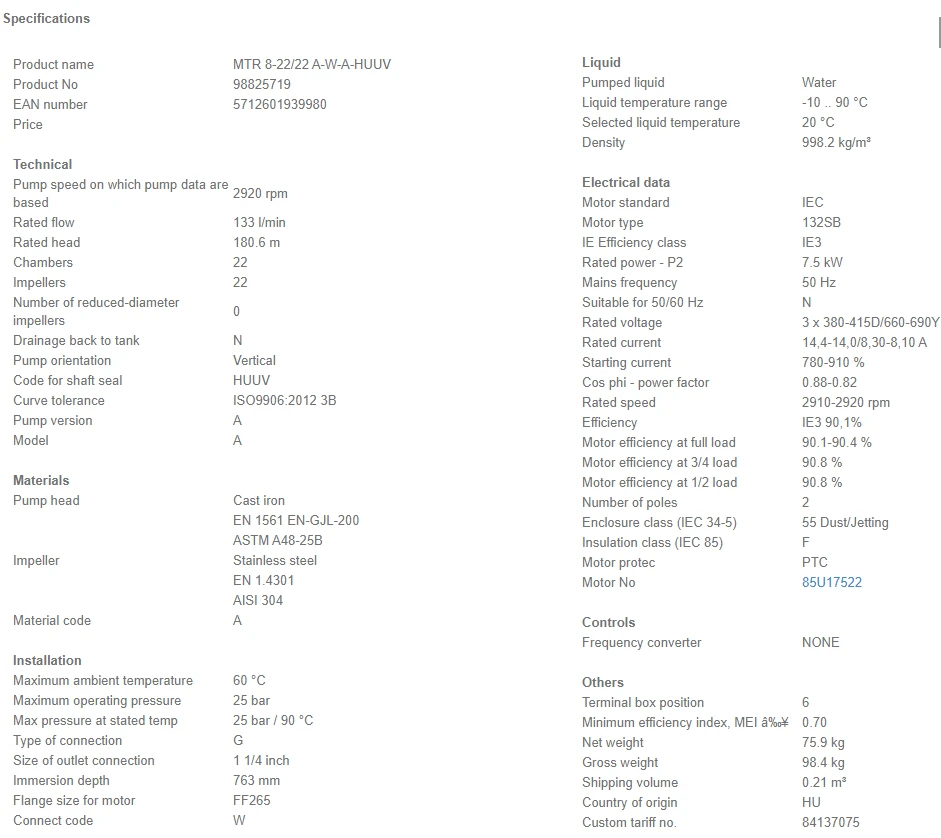 Grundfos MTR 8 22/22 A W A HUUV 7.5kW Stainless Steel Vertical Immersible Pump 415v