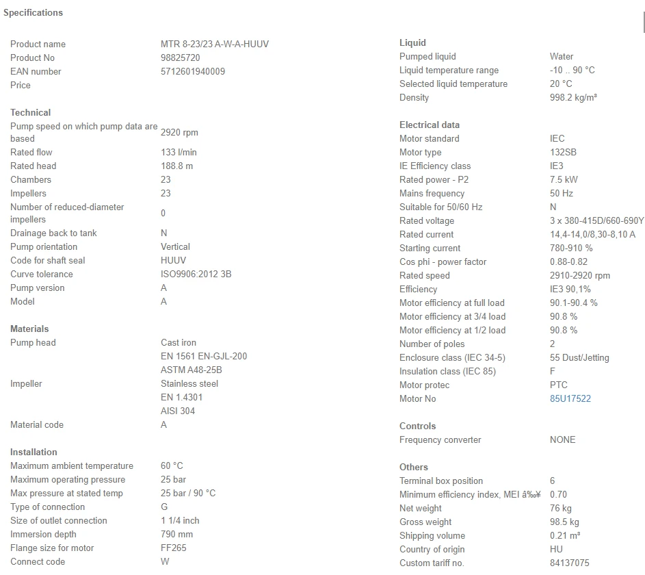 Grundfos MTR 8 23/23 A W A HUUV 7.5kW Stainless Steel Vertical Immersible Pump 415v