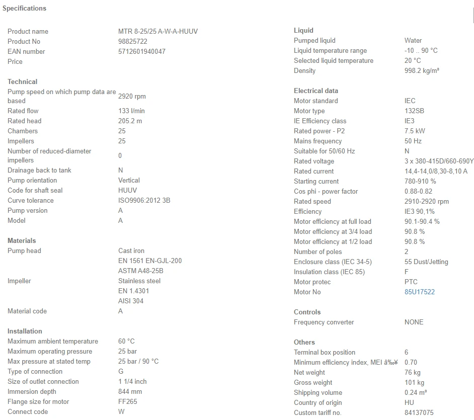 Grundfos MTR 8 25/25 A W A HUUV 7.5kW Stainless Steel Vertical Immersible Pump 415v