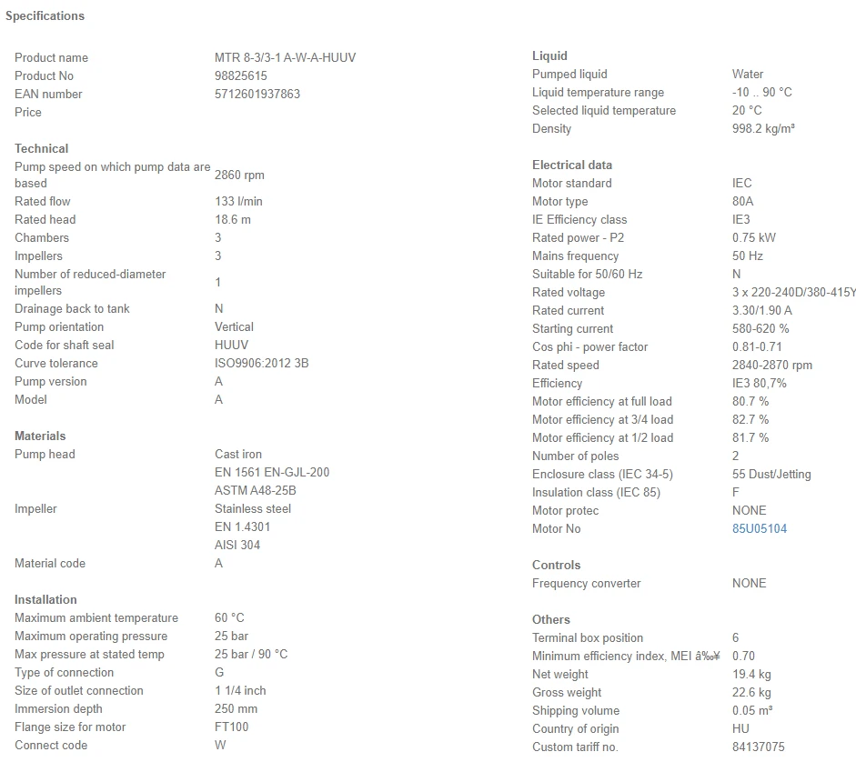 Grundfos MTR 8 3/3-1 A W A HUUV 0.75kW Stainless Steel Vertical Immersible Pump 415v