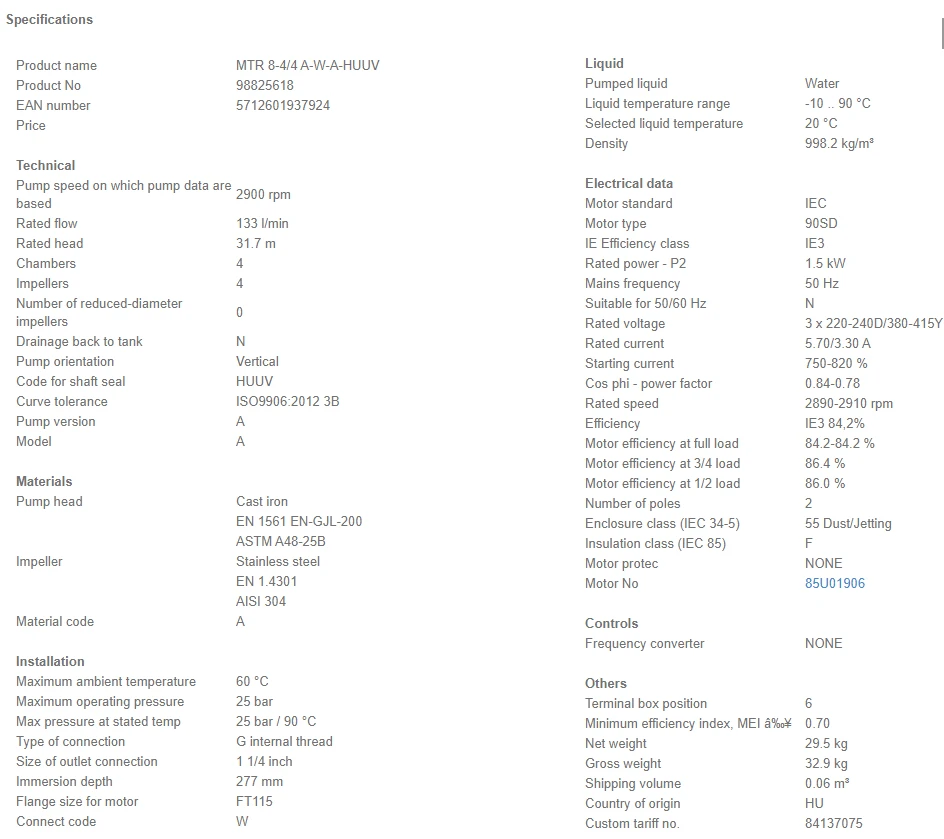 Grundfos MTR 8 4/4 A W A HUUV 1.5kW Stainless Steel Vertical Immersible Pump 415v