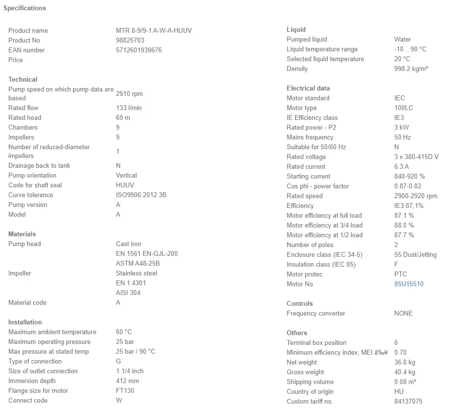 Grundfos MTR 8 9/9-1 A W A HUUV 3kW Stainless Steel Vertical Immersible Pump 415v