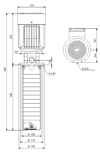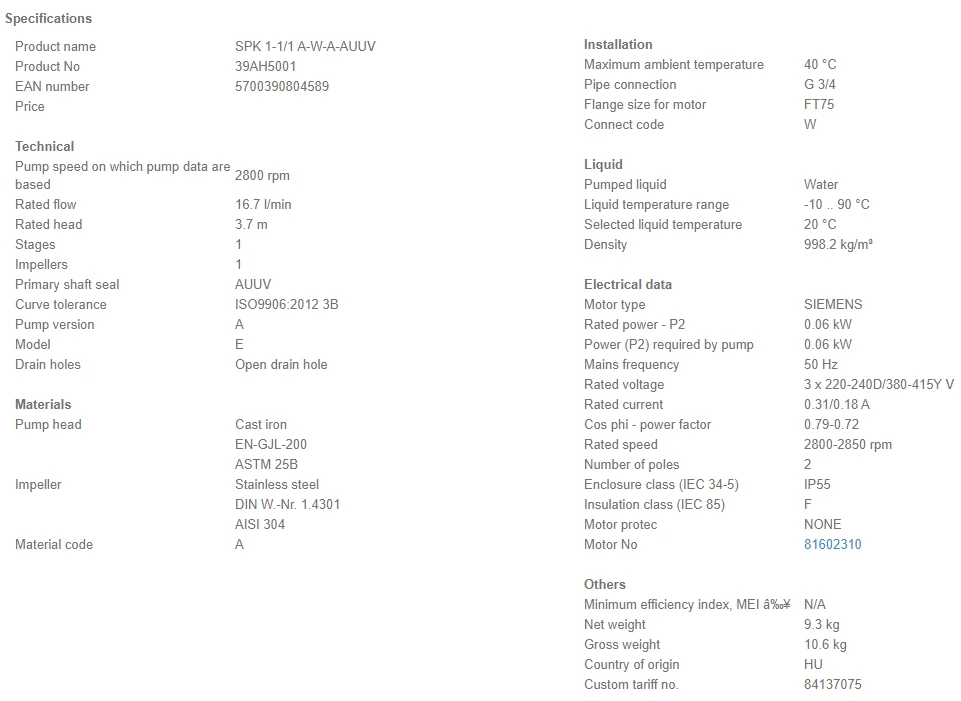 - Impellers, intermediate chambers and spline shaft are made of stainless steel and motor stool of GG 20.