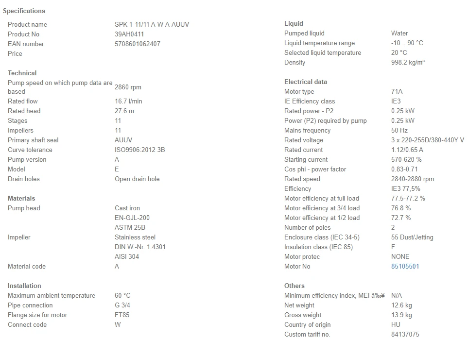 - Impellers, intermediate chambers and spline shaft are made of stainless steel and motor stool of GG 20.