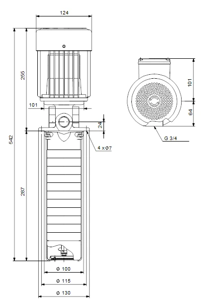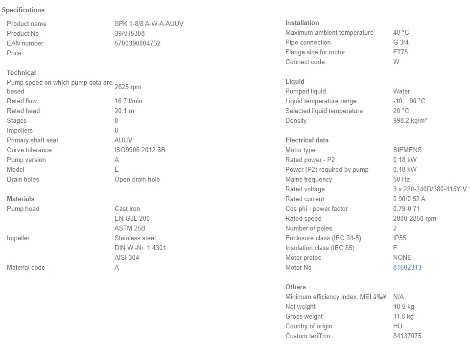 - Impellers, intermediate chambers and spline shaft are made of stainless steel and motor stool of GG 20.
