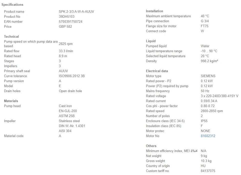 - Impellers, intermediate chambers and spline shaft are made of stainless steel and motor stool of GG 20.