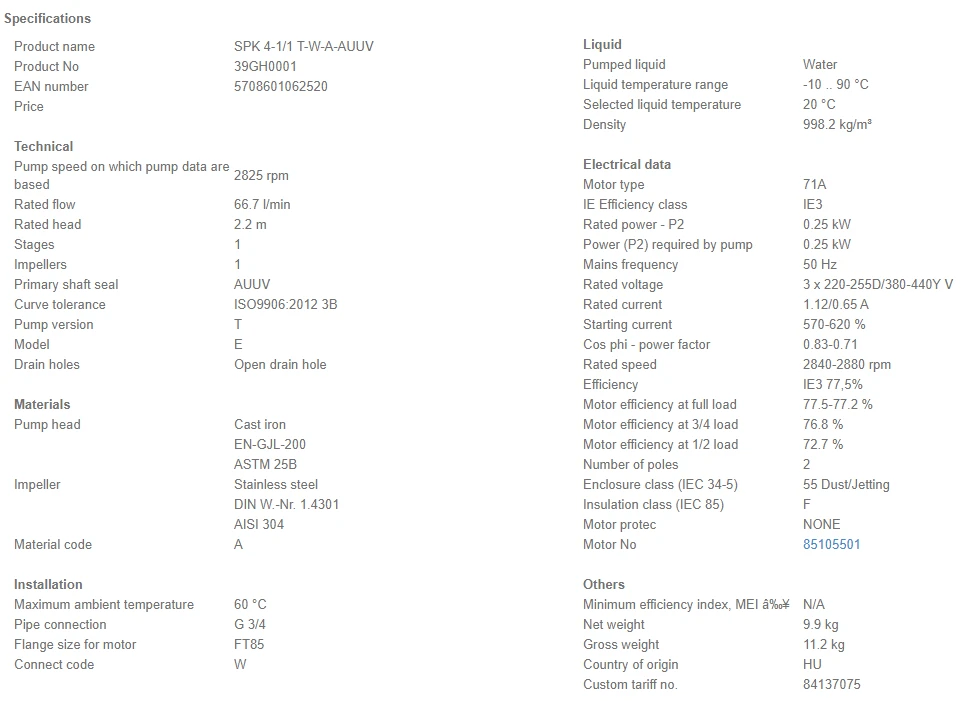 Grundfos SPK 4 1/1 A W A AUUV 0.25kW Stainless Steel Immersible Pump 415v