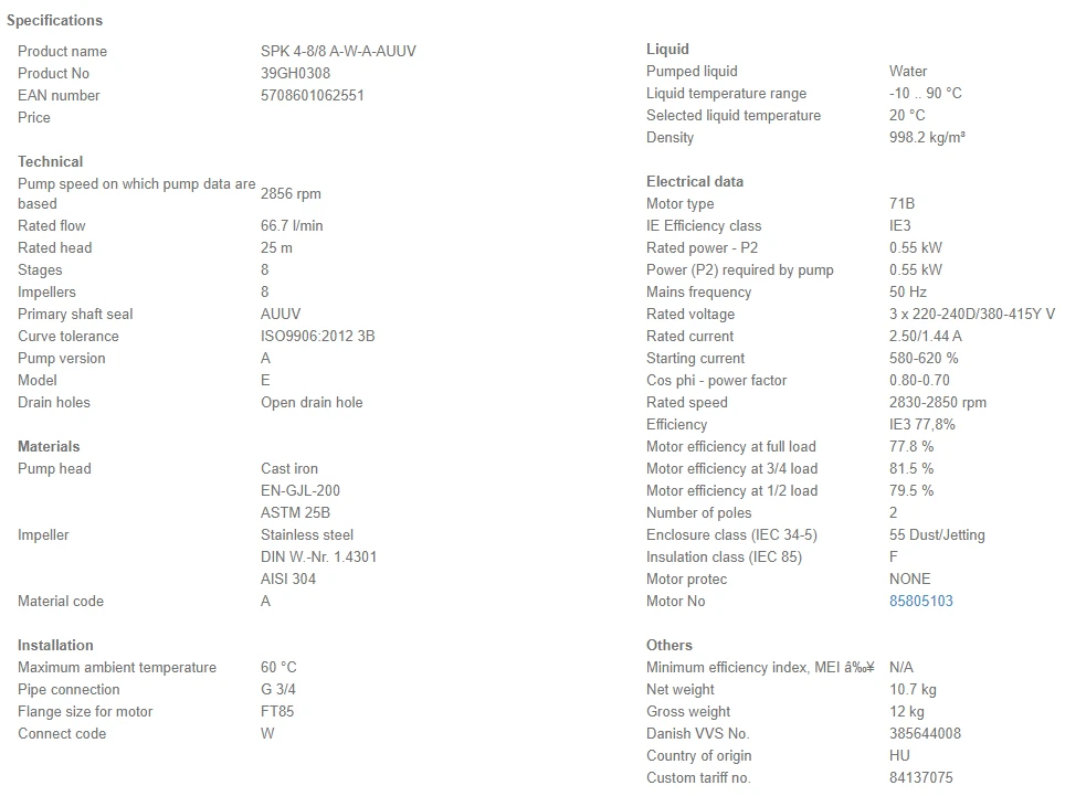 - Impellers, intermediate chambers and spline shaft are made of stainless steel and motor stool of GG 20.